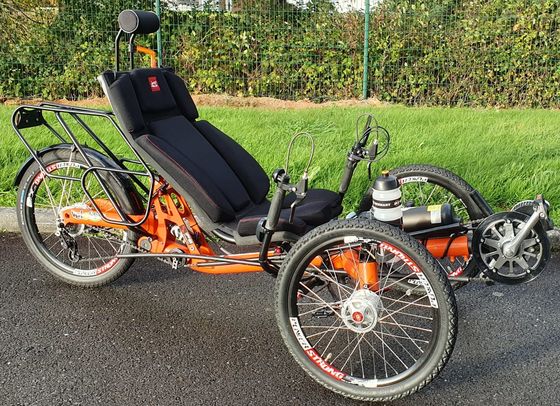 Tricycle AZUB Tricon 20 (suspendu arrière, 3 roues de 20") orange, boîte Rohloff 14 vitesses, moteur Sunstar, 2 batteries, garde-boue arrière, porte-bagages 4 sacoches, etc.